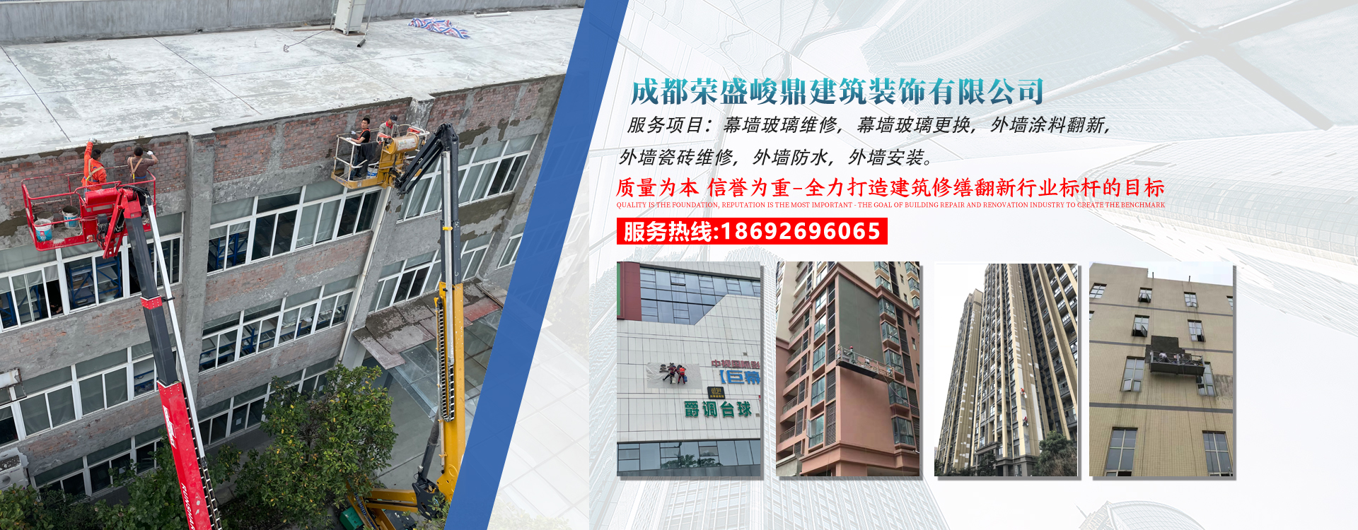 成都榮盛峻鼎建筑裝飾有限公司始終堅持發(fā)揚工匠精神的專業(yè)施工團隊,專業(yè)于舊建筑修繕翻新的研究與實踐;服務包括外墻維修、外墻翻新、外墻磚維修、外墻防水處理、內(nèi)外墻涂料維修、幕墻玻璃維修、門...